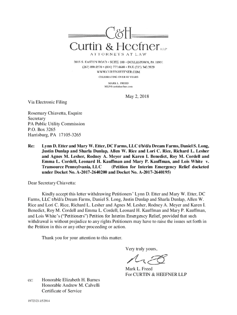 CELEBRATING OVER 80 YEARS MARK L. FREED MLF×curtinheefner.comma 2, 2018 Via Electronic Filing Rosemary Ciabatta, Esquire Secretary PA Public Utility Commission P.O. Box 3265 Harrisburg, PA 171053265