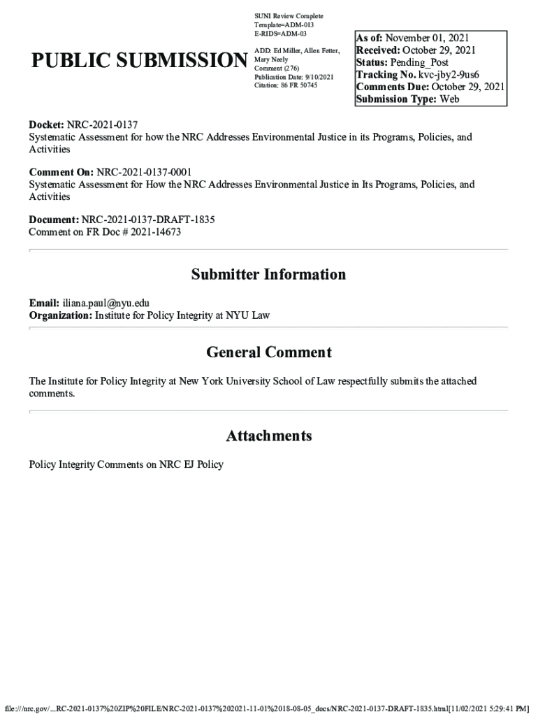 SUN Review Complete TemplateADM013 ERIDSADM03PUBLIC SUBMISSION ADD: Ed Miller, Allen Fetter, Mary Newly Comment (276) Publication Date: 9/10/2021 Citation: 86 FR 50745As of: November 01, 2021, Received: