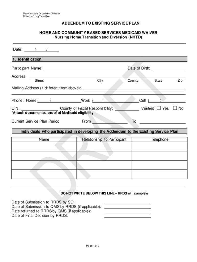 New York State Department Of Health Division of Long Term CareADDENDUM TO EXISTING SERVICE PLAN HOME AND COMMUNITY BASED SERVICES MEDICAID WAIVER Nursing Home Transition and Diversion (NTD) Date://1.
