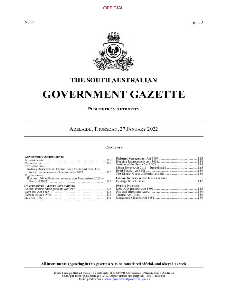 OFFICIAL No. 6p. 113THE SOUTH AUSTRALIANGOVERNMENT GAZETTE PUBLISHED BY AUTHORITYADELAIDE, THURSDAY, 27 JANUARY 2022 CONTENTS GOVERNORS INSTRUMENTS Appointments ............................................................................