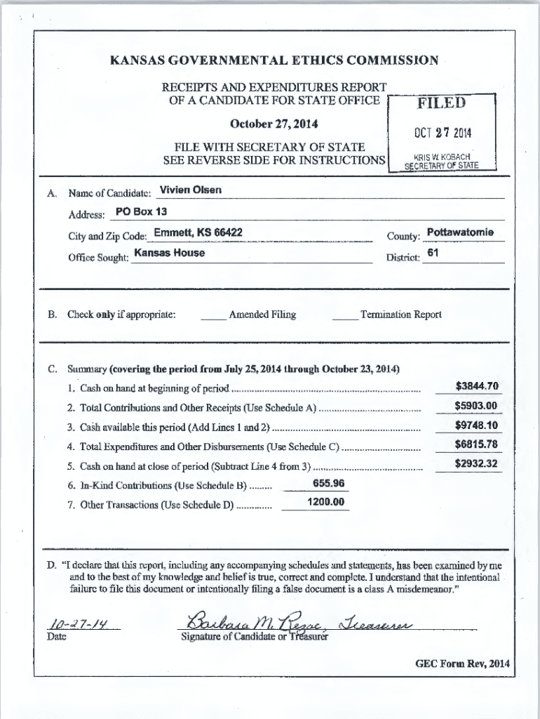 KANSAS GOVERNMENTAL ETHICS COMMISSION RECEIPTS AND EXPENDITURES REPORT OF A CANDIDATE FOR STATE OFFICE. F1LE:D:, October 27, 2014OCT 2 7 2014FILE WITH SECRETARY OF STATE SEE REVERSE SIDE FOR INSTRUCTIONS