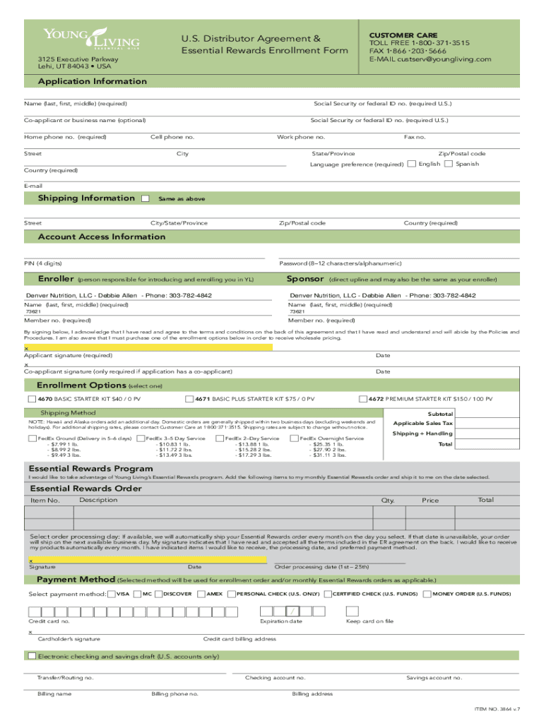 U.S. Distributor Agreement & Essential Rewards Enrollment Form3125 Executive Parkway Levi, UT 84043 USA customer Care toll-free 1 800 371 3515 fax 1 866 203 5666 email Custer×young living. Complication