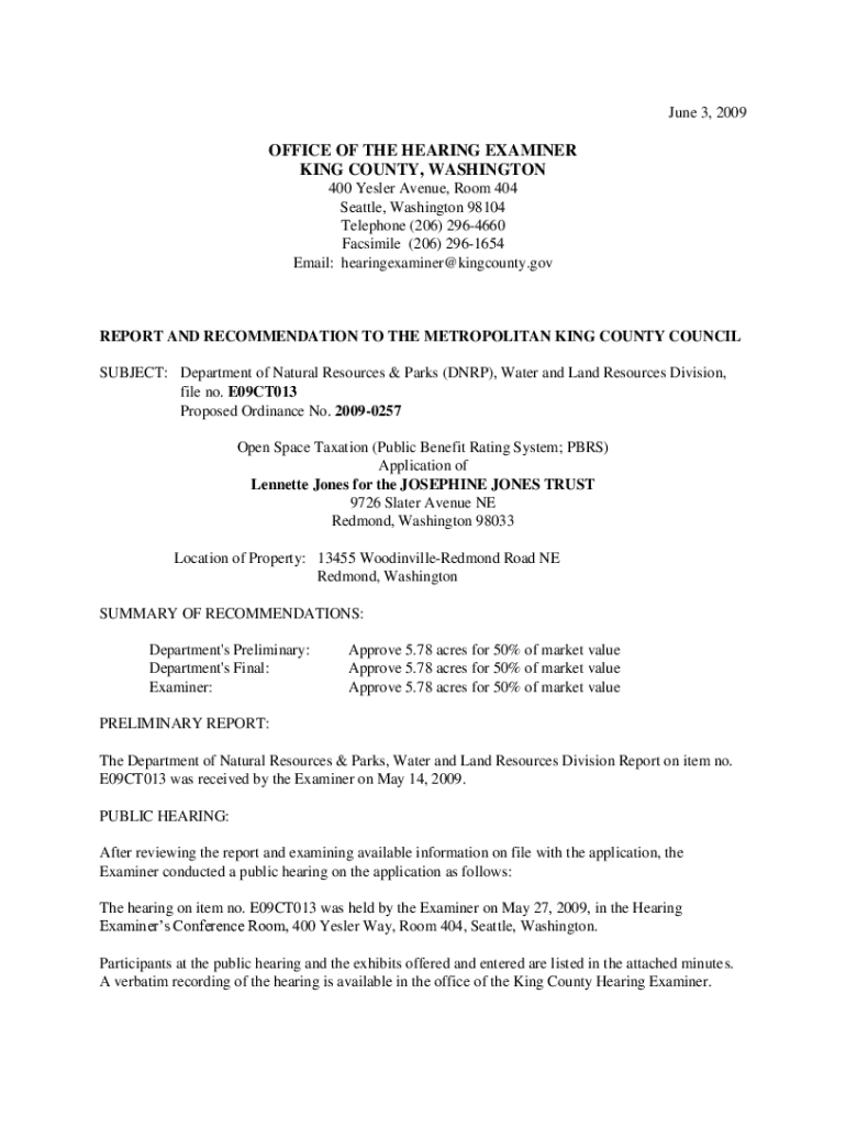 June 3, 2009OFFICE OF THE HEARING EXAMINER KING COUNTY, WASHINGTON 400 Lesser Avenue, Room 404 Seattle, Washington 98104 Telephone (206) 2964660 Facsimile (206) 2961654 Email: hearing examiner×King