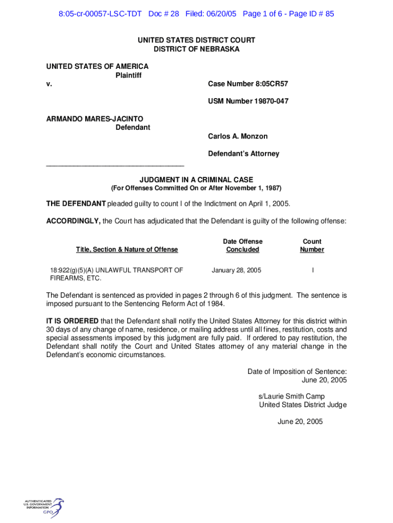 8:05cr00057LSCTDT Doc # 28 Filed: 06/20/05-Page 1 of 6-Page ID # 85 UNITED STATES DISTRICT COURT DISTRICT OF NEBRASKA UNITED STATES OF AMERICA Plaintiff v. Case Number 8:05CR57 US Number 19870047ARMANDO