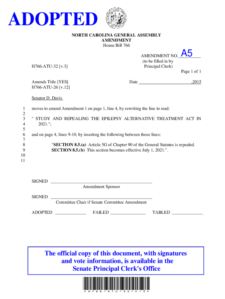 ADOPTED NORTH CAROLINA GENERAL ASSEMBLY AMENDMENT House Bill 766A5AMENDMENT NO. ___ (to be filled in by Principal Clerk) Page 1 of 1H766ATU32 [v.3×Amends Title [YES] H766ATU26 [v.12×Date,2015Senator