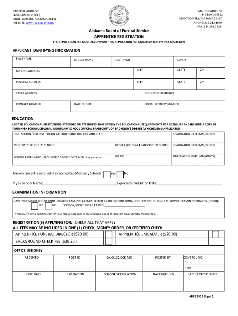 PHYSICAL ADDRESS: 4276 LOCAL STREET MONTGOMERY, ALABAMA 36106 WEBSITE: www.fsb.alabama.govMAILING ADDRESS: P O BOX 309522 MONTGOMERY, ALABAMA 36130 PHONE: 334.242.4049 FAX: 334.353.7988Alabama Board