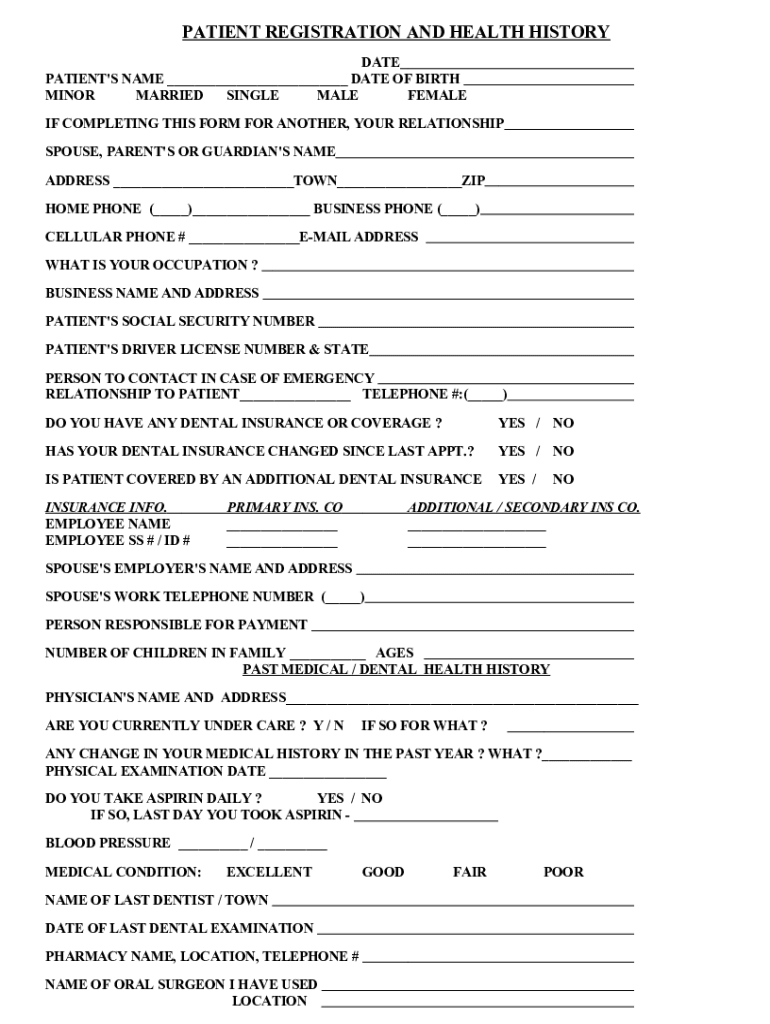 PATIENT REGISTRATION AND HEALTH HISTORY DATE PATIENT\'S NAME ___ DATE OF BIRTH MINOR MARRIED SINGLE MALE FEMALE IF COMPLETING THIS FORM FOR ANOTHER, YOUR RELATIONSHIP SPOUSE, PARENT\'S OR GUARDIAN\'S