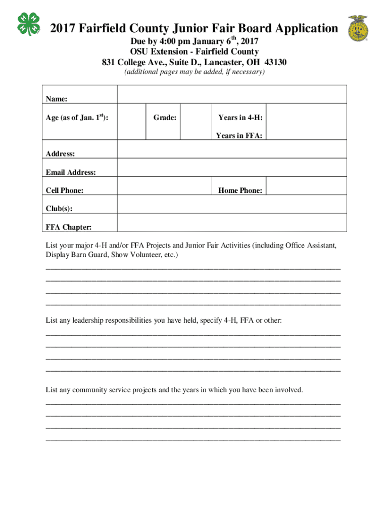 2017 Fairfield County Junior Fair Board Application Due by 4:00 pm January 6th, 2017 OSU Extension Fairfield County 831 College Ave., Suite D., Lancaster, OH 43130 Junior Fair Board members are selected