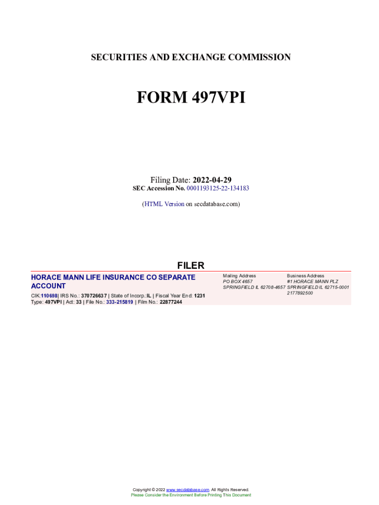 SECURITIES AND EXCHANGE COMMISSIONER 497VPIFiling Date: 20220429SEC Accession No. 000119312522134183 (HTML Version on secdatabase.com)FILER HORACE MANN LIFE INSURANCE CO SEPARATE ACCOUNT CIK:110698|