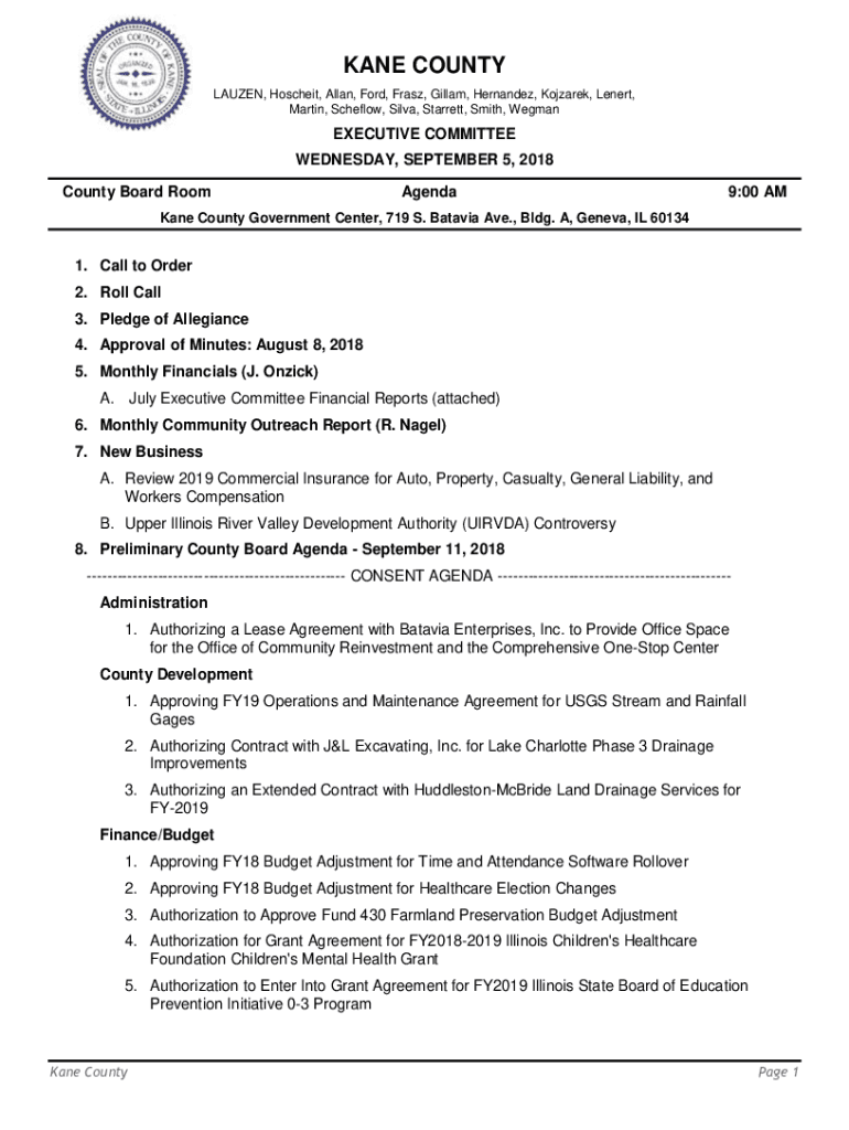 KANE COUNTY LAUREN, Conceit, Allan, Ford, Franz, Gilliam, Hernandez, Korean, Desert, Martin, Shallow, Silva, Sterrett, Smith, WegmanEXECUTIVE COMMITTEE WEDNESDAY, SEPTEMBER 5, 2018, County Board RoomAgenda9:00