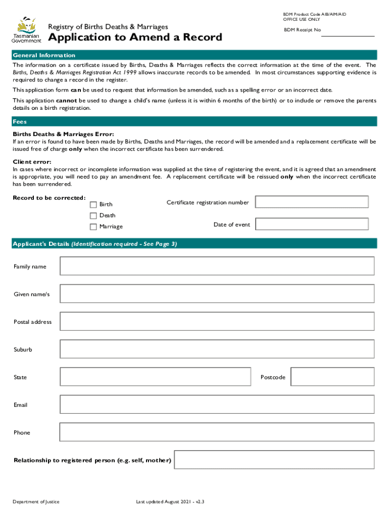 BDM Product Code AIB/AIM/AID OFFICE USE ONLYRegistry of Births Deaths & MarriagesApplication to Amend a Record BDM Receipt General Information The information on a certificate issued by Births, Deaths