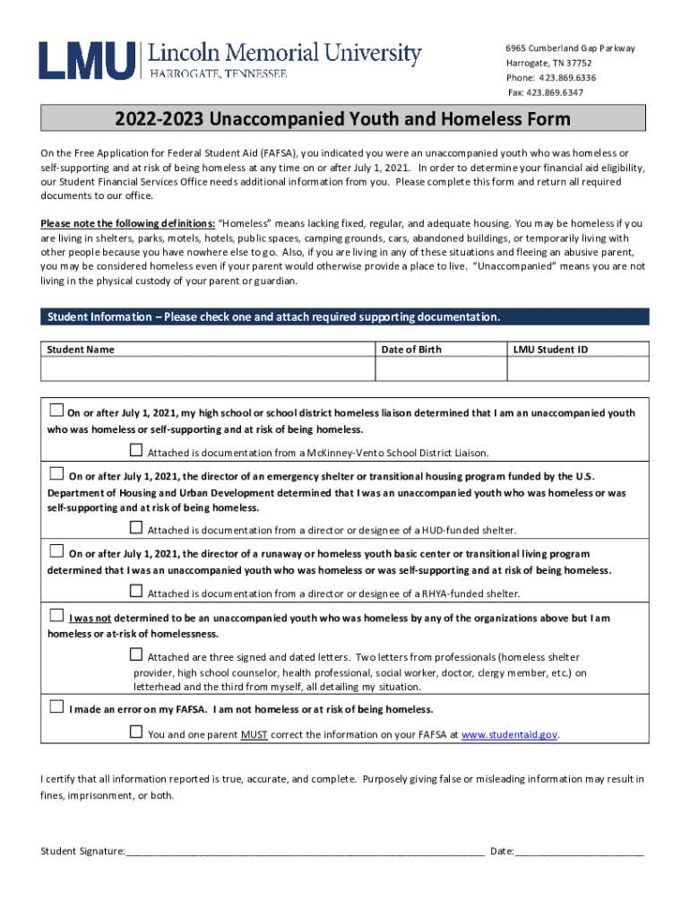 6965 Cumberland Gap Parkway Arrogate, TN 37752 Phone: 423.869.6336 Fax: 423.869.634720222023 Unaccompanied Youth and Homeless Form On the Free Application for Federal Student Aid (FAFSA), you indicated