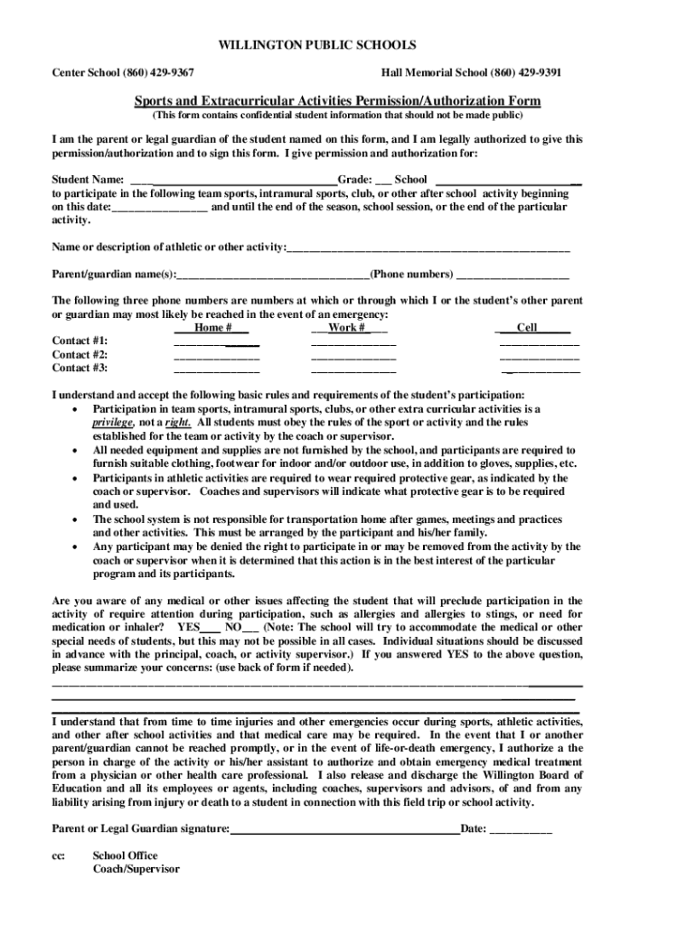 WELLINGTON PUBLIC SCHOOLS Center School (860) 4299367Hall Memorial School (860) 4299391Sports and Extracurricular Activities Permission/Authorization Form (This form contains confidential student