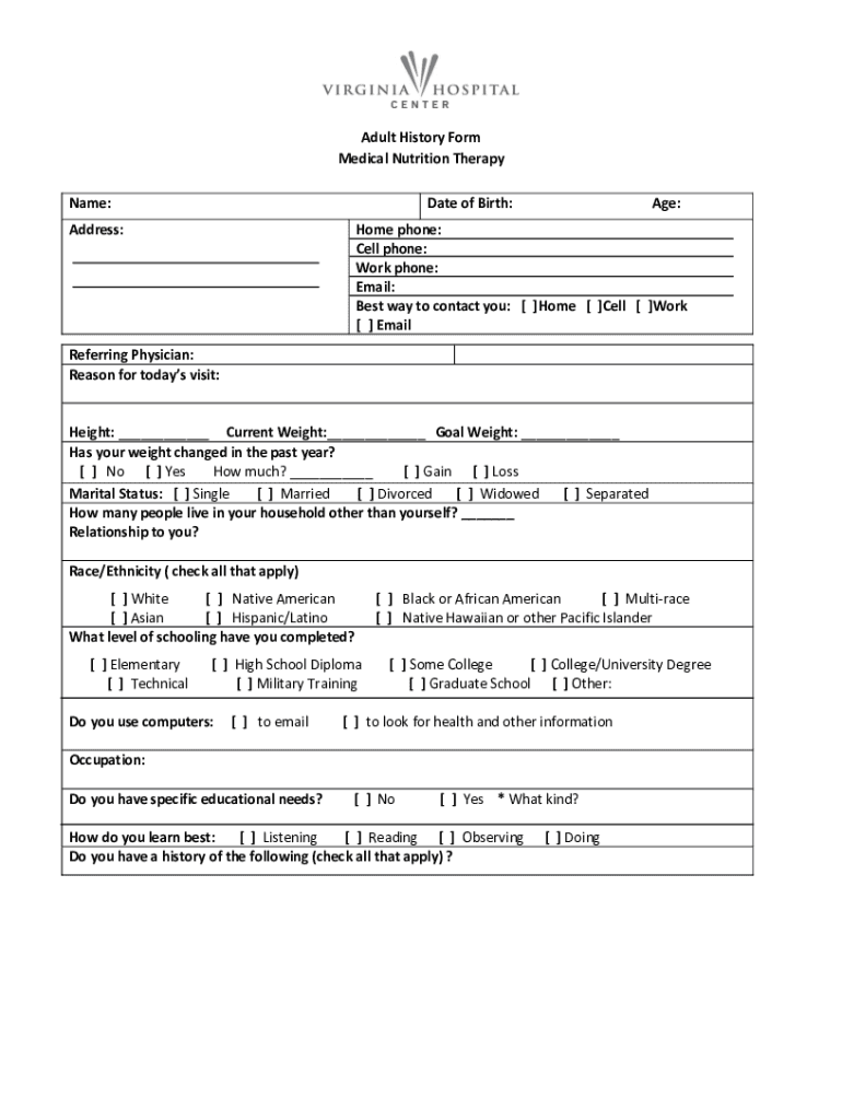 Adult History Form Medical Nutrition Therapy Name:Date of Birth:Address:Age:Home phone: Cell phone: Work phone: Email: the Best way to contact you: [ ]Home [ ]Cell [ ]Work [ ] EmailReferring Physician: