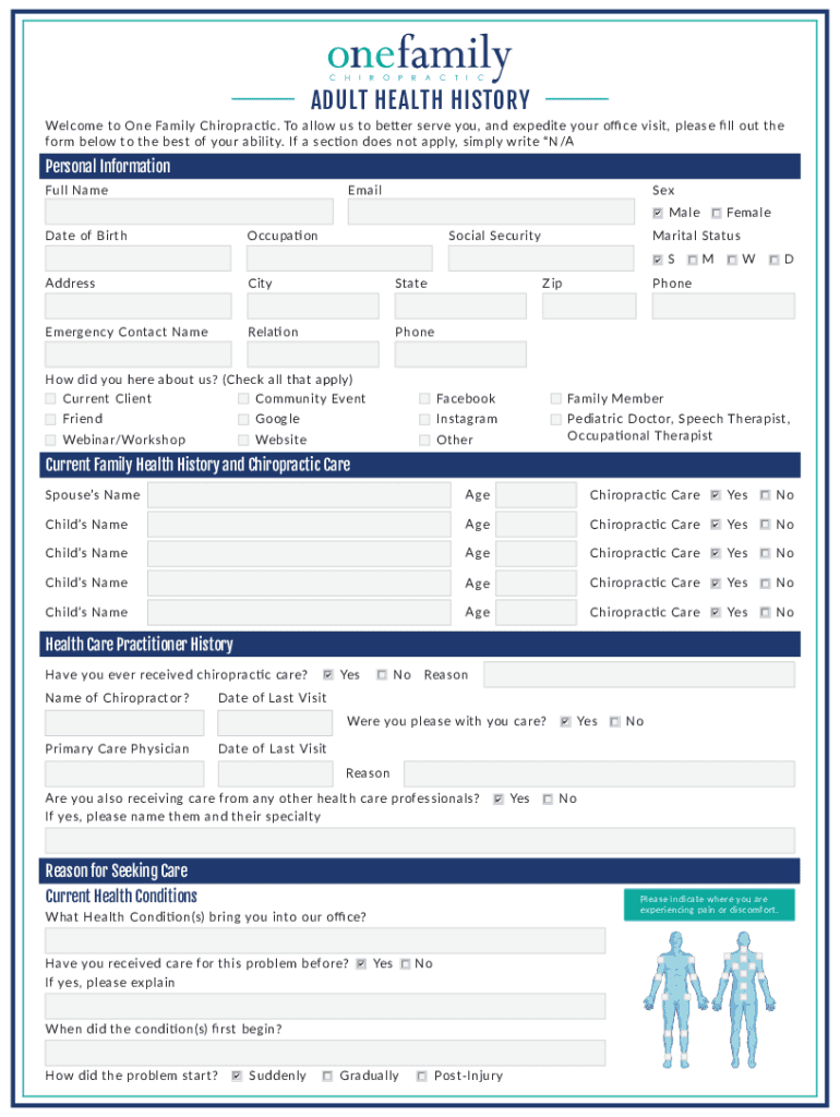 CHIROPRACTICADULT HEALTH HISTORY Welcome to One Family Chiropractic. To allow us to better serve you, and expedite your one visit, please ll out the form below to the best of your ability. If a section