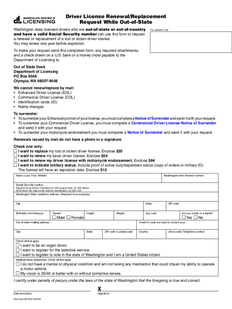 Click here to START or CLEAR, then hit the TAB buttonDriver License Renewal/Replacement Request While OutofState Washington state licensed drivers who are outofstate or outofcountry and have a valid
