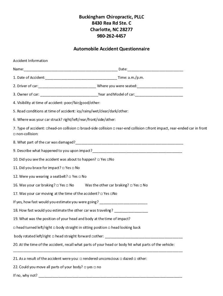 Buckingham Chiropractic, LLC 8430 REA Rd Ste. C Charlotte, NC 28277 9802624457 Automobile Accident Questionnaire Accident Information Name:___ Date:___ 1. Date of Accident:___ Time: a.m./p.m. 2. Driver