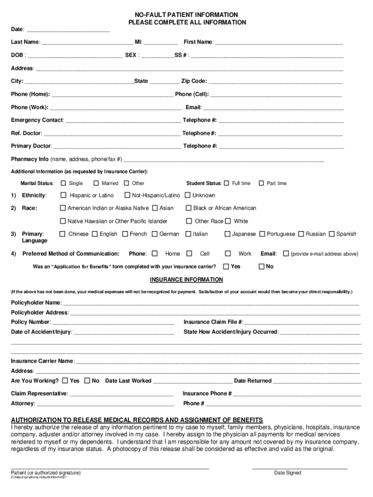 DEFAULT PATIENT INFORMATION PLEASE COMPLETE ALL INFORMATION Date: ___ Last Name: ___ MI: ___First Name: ___DOB : ___ SEX : ___SS # : ___ Address: ___ City: ___State ___ Zip Code: ___ Phone (Home):