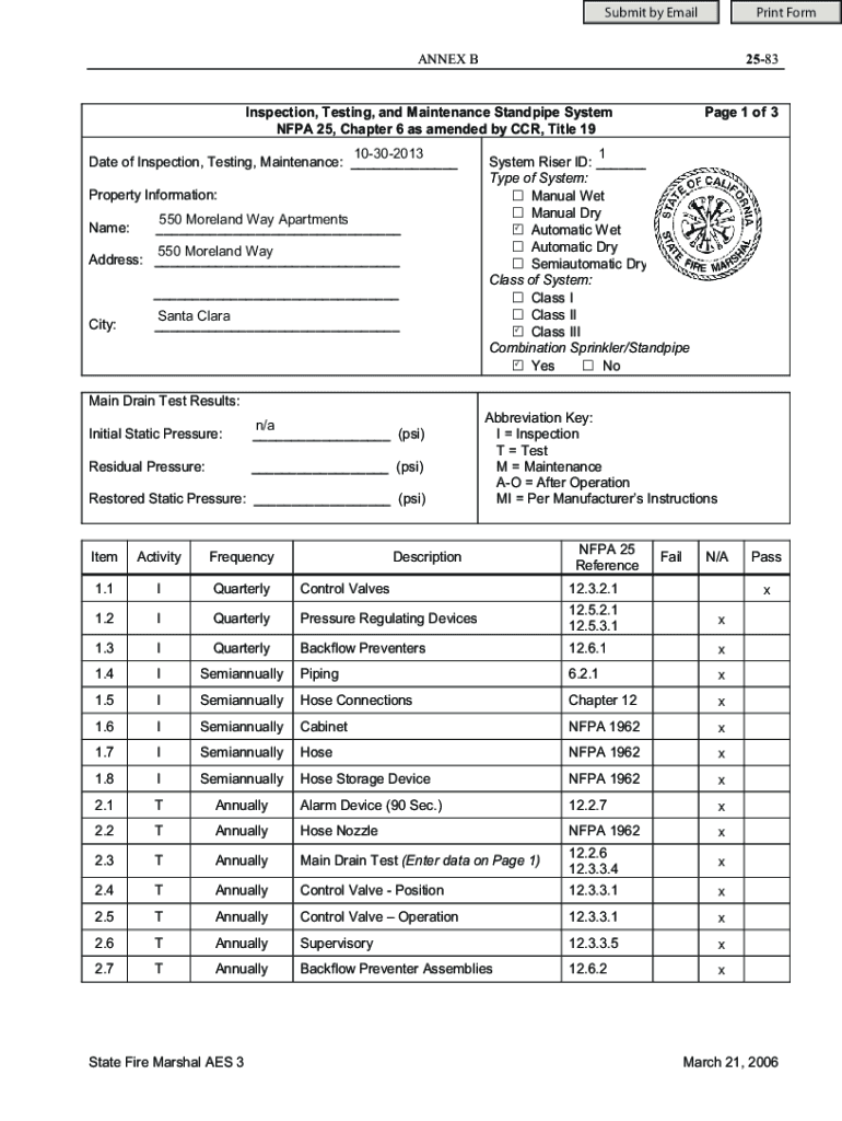 Submit by Emailing Form 2583ANNEX Inspection, Testing, and Maintenance Standpipe System NFPA 25, Chapter 6 as amended by CCR, Title 1910302013 Date of Inspection, Testing, Maintenance: ___ Property