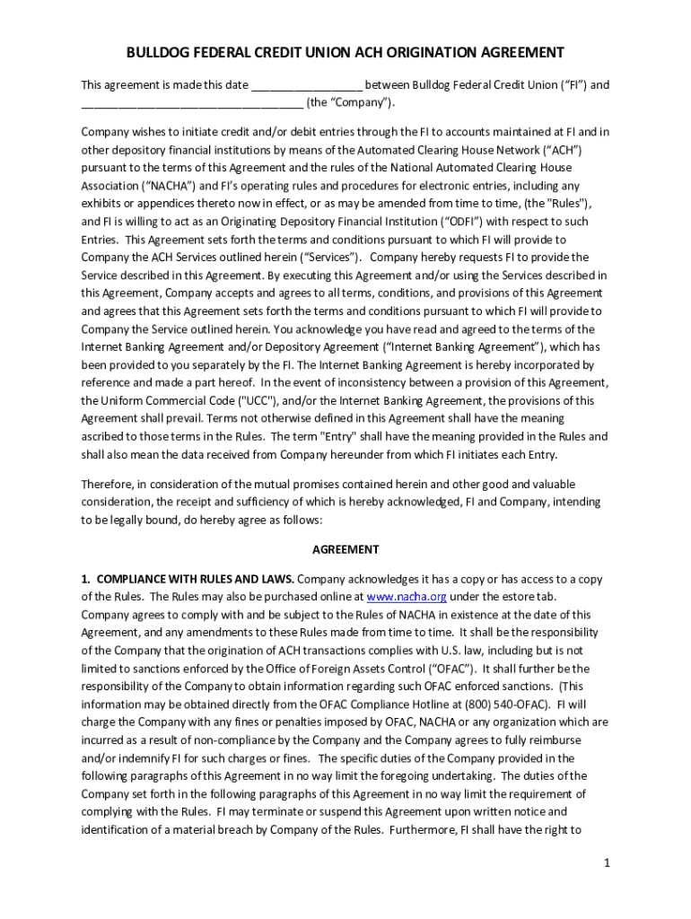 Get the free BULLDOG FEDERAL CREDIT UNION ACH ORIGINATION AGREEMENT