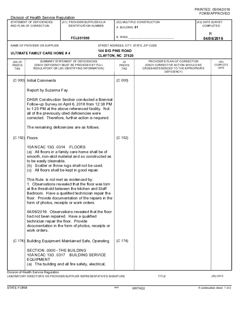 PRINTED: 05/04/2016 FORM APPROVEDDivision of Health Service Regulation STATEMENT OF DEFICIENCIES AND PLAN OF CORRECTION(X1) PROVIDER/SUPPLIER/CIA IDENTIFICATION NUMBER:(X2) MULTIPLE CONSTRUCTION A.