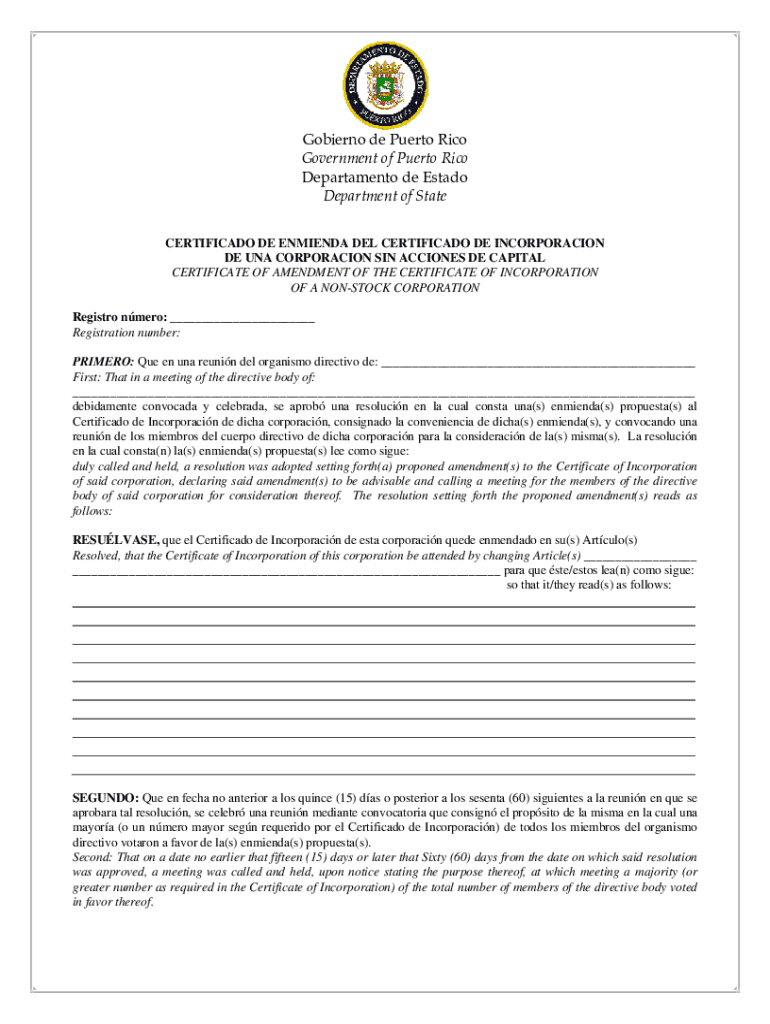 Governor de Puerto Rico Government of Puerto Rico Department de Estado Department of State CERTIFICATE DE ENCOMIENDA DEL CERTIFICATE DE INCORPORATION DE RNA CORPORACIÓN SIN ACTIONS DE CAPITAL CERTIFICATE