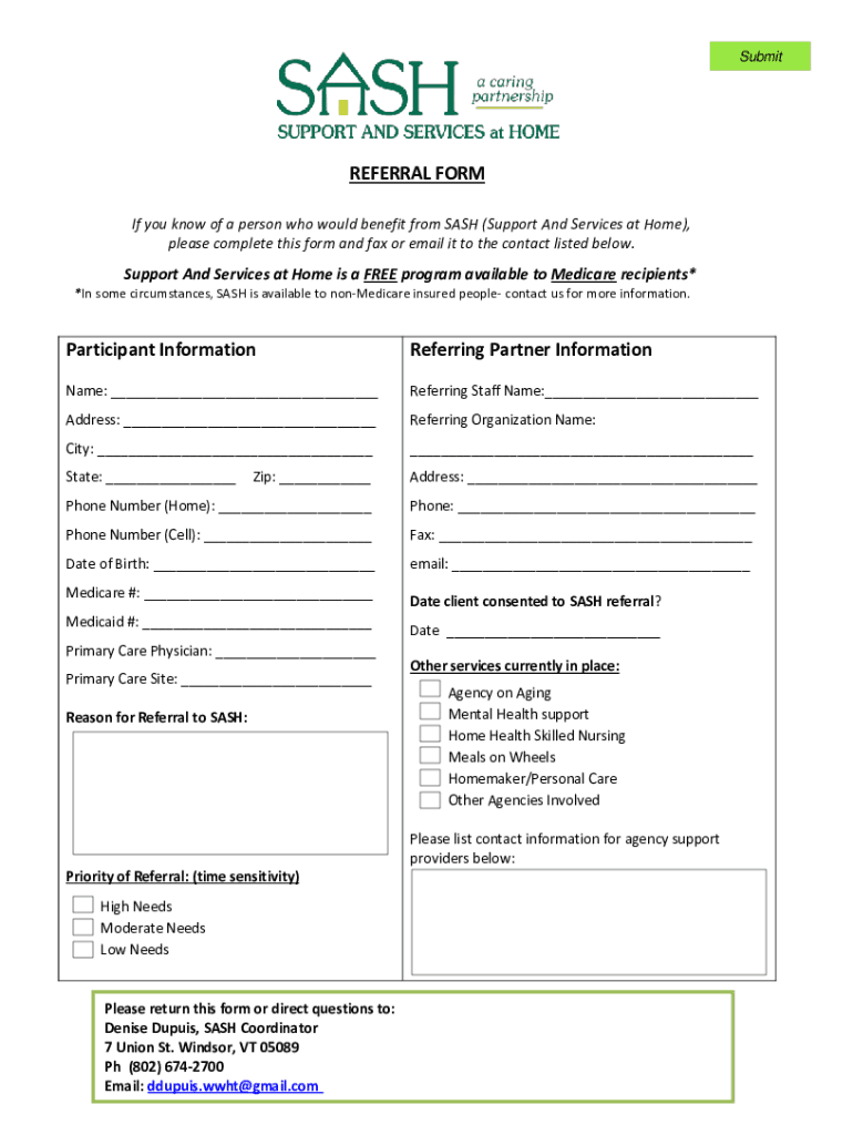 SubmitREFERRAL FORM If you know of a person who would benefit from SASH (Support And Services at Home), please complete this form and fax or email it to the contact listed below. Support And Services