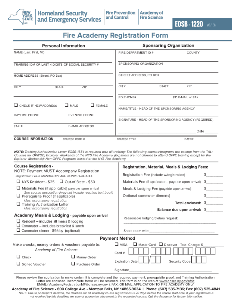 (8/18)Fire Academy Registration Form Sponsoring OrganizationPersonal Information NAME (Last, First, MI)FIRE DEPARTMENT ID #TRAINING ID # OR LAST 4 DIGITS OF SOCIAL SECURITY #SPONSORINGORGANIZATIONHOME