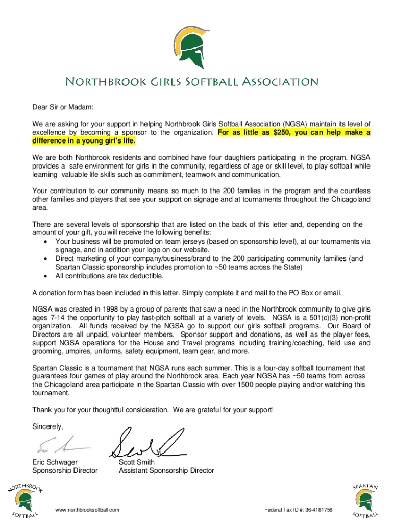 Dear Sir or Madam: We are asking for your support in helping Northbrook Girls Softball Association (NASA) maintain its level of excellence by becoming a sponsor to the organization. For as little