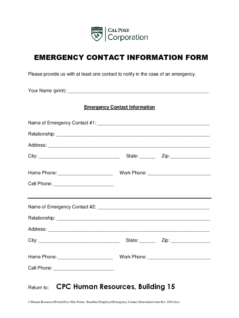 Include emergency contact details, such as the name, phone number, and relationship of at least two individuals who can be contacted in case of an emergency.