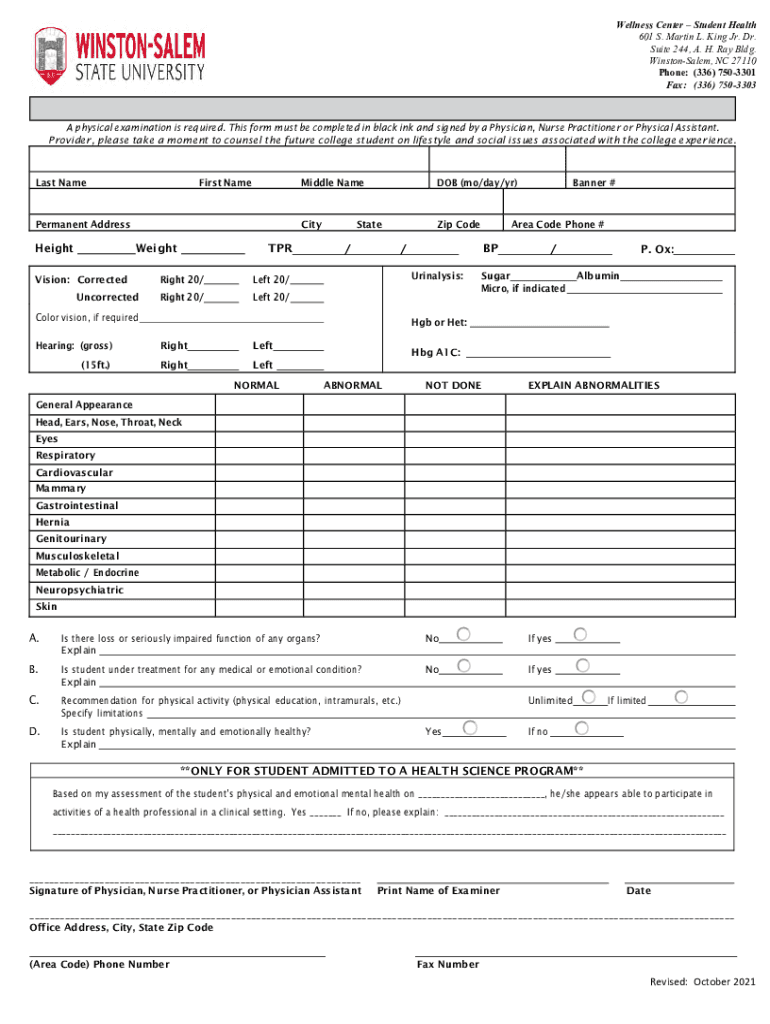 Wellness Center Student Health 601 S. Martin L. King Jr. Dr. Suite 244, A. H. Ray Bldg. Winston-Salem, NC 27110 Phone: (336) 7503301 Fax: (336) 7503303PHYSICAL EXAMINATION A physical examination is
