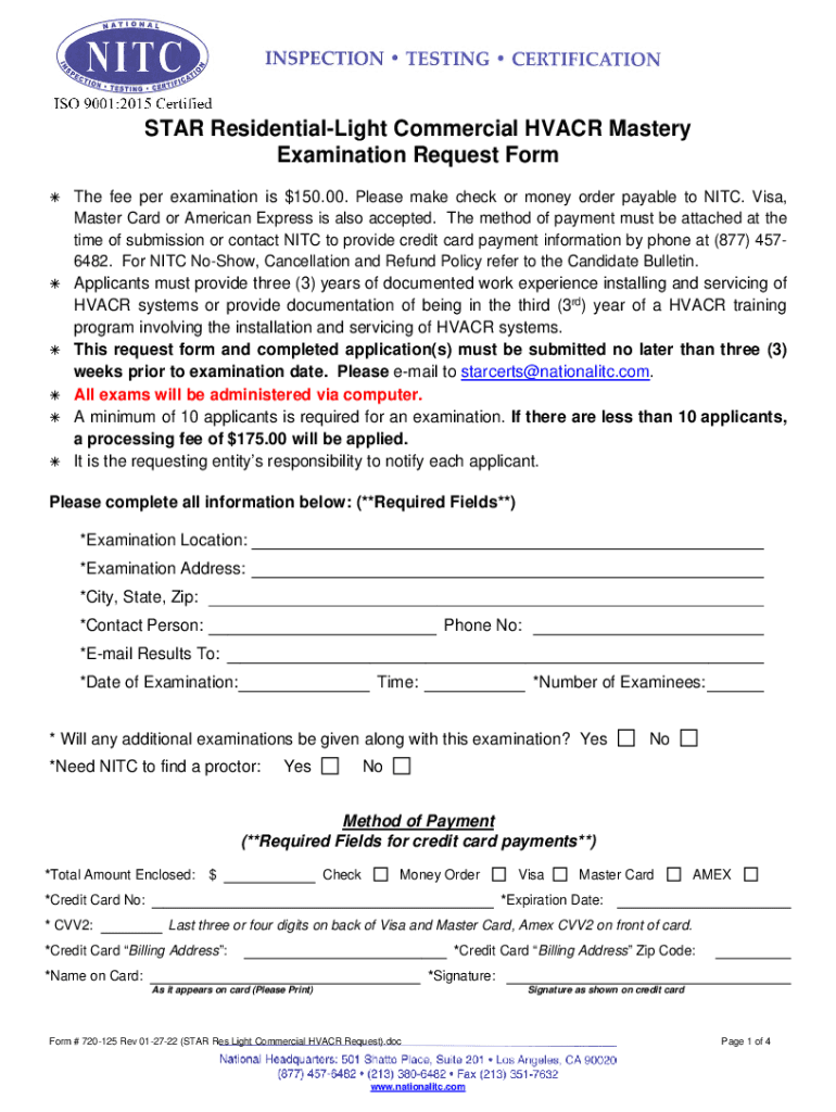 STAR ResidentialLight Commercial HVAC Mastery Examination Request Form The fee per examination is $150.00. Please make check or money order payable to ITC. Visa, Master Card or American Express is