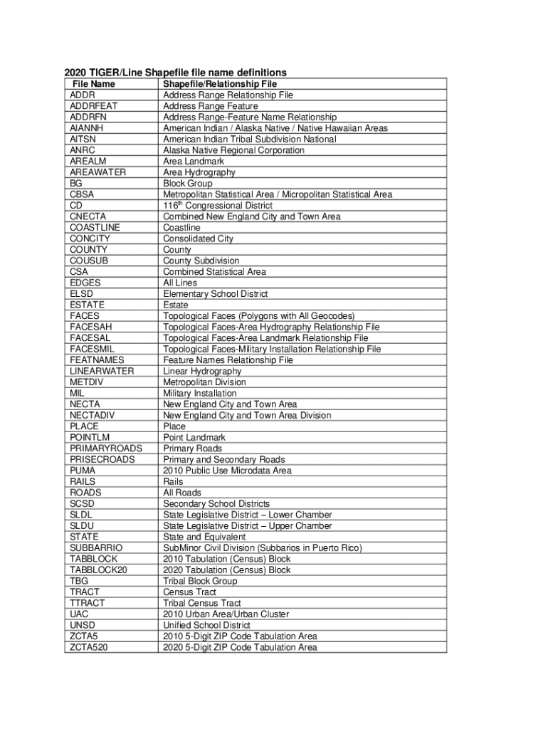 2020 TIGER/Line Shape file name definitions File Name ADD DEFEAT ADD RFN DIANNE AI TSN ARC REALM SEAWATER BGC BSA CD CNE CTA COASTLINE CONCISE COUNTY COUSIN CSA EDGES ELSE ESTATE FACES FACE SAH FACES