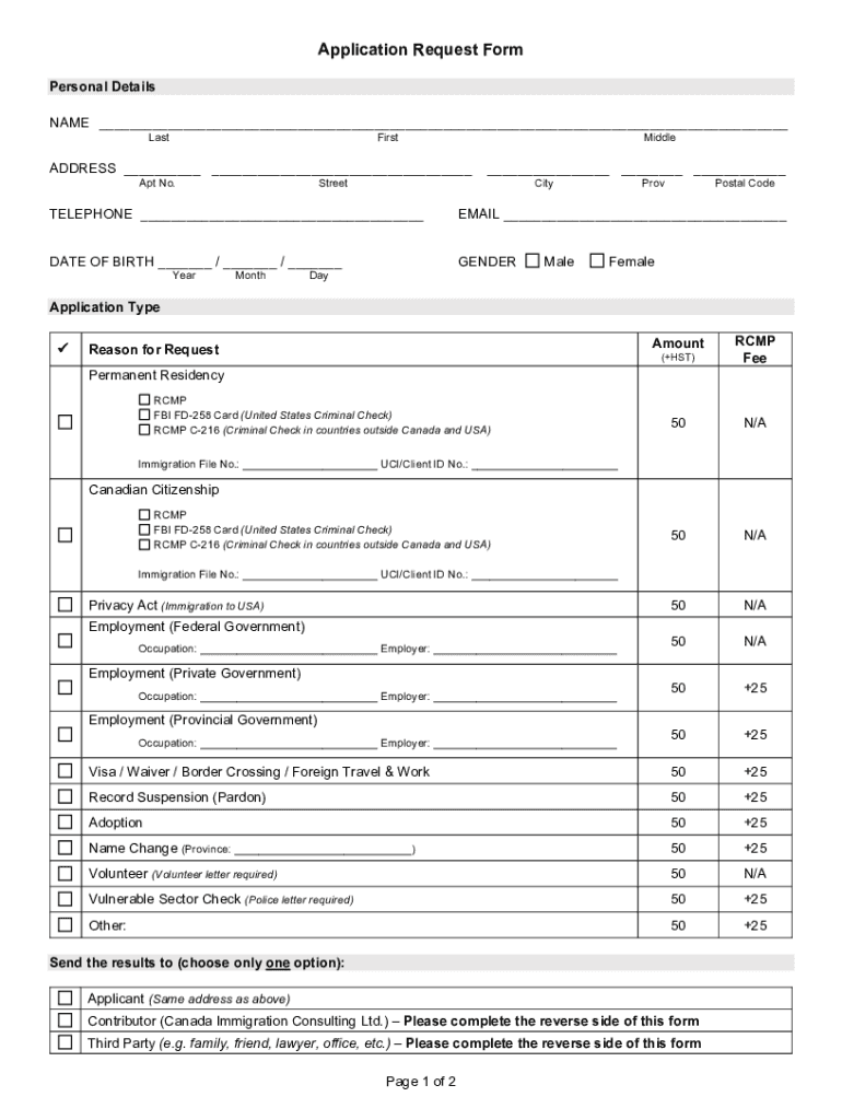 Application Request Form Personal Details NAME ___ LastFirstMiddleADDRESS ___ ___ Apt No.___ ___ ___StreetCityProvPostal CodeTELEPHONE ___EMAIL ___DATE OF BIRTH ___ / ___ / ___GENDERYearMonthMaleFemaleDayApplication