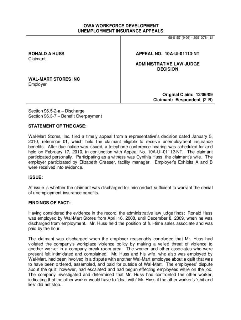 IOWA WORKFORCE DEVELOPMENT UNEMPLOYMENT INSURANCE APPEALS 680157 (906) 3091078 RONALD A HUTS ClaimantAPPEAL NO. 10AUI01113NT ADMINISTRATIVE LAW JUDGE DECISIONWALMART STORES INC Employer Original Claim: