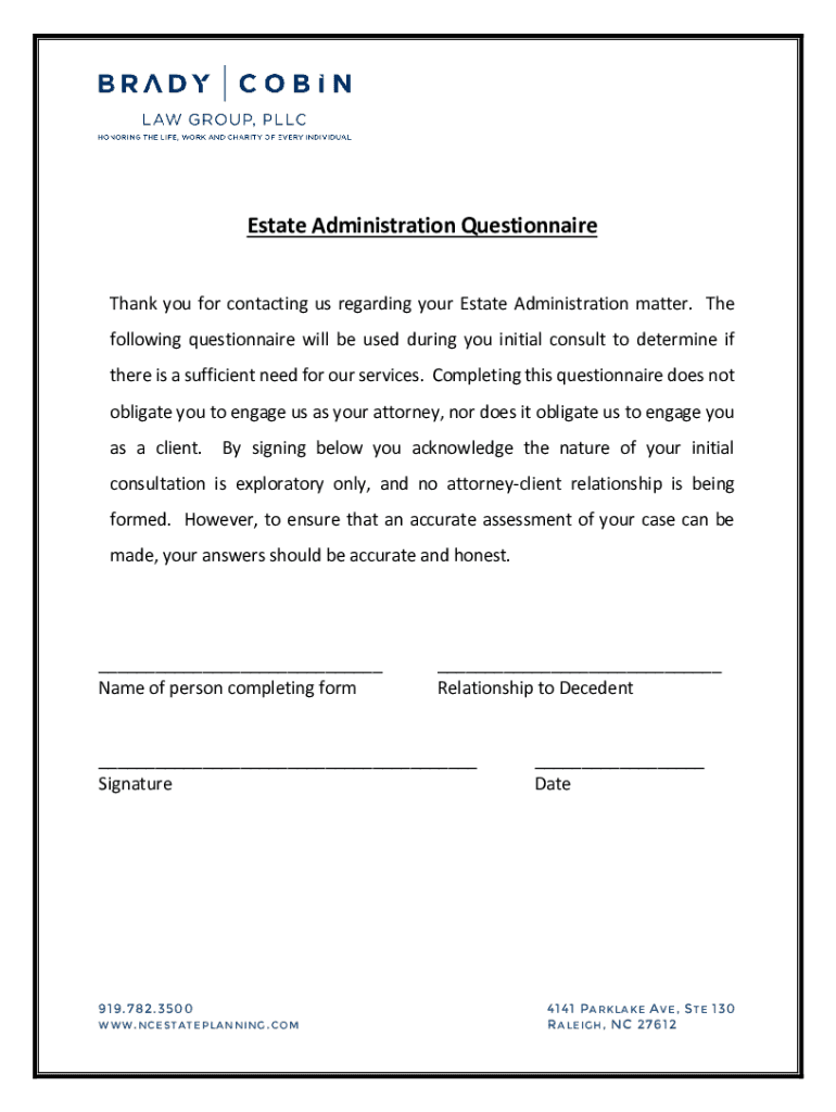 Estate Administration Questionnaire Thank you for contacting us regarding your Estate Administration matter. The following questionnaire will be used during you initial consult to determine if there