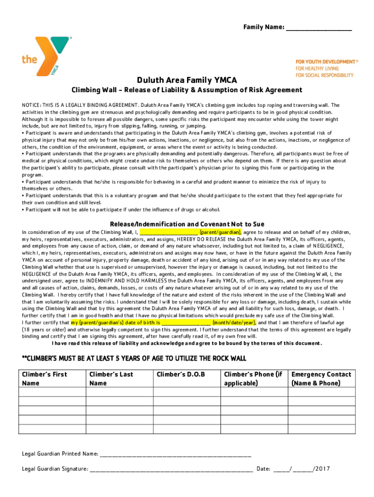 Family Name: ___Duluth Area Family YMCA Climbing Wall Release of Liability & Assumption of Risk Agreement NOTICE: THIS IS A LEGALLY BINDING AGREEMENT. Duluth Area Family YMCA's climbing gym includes