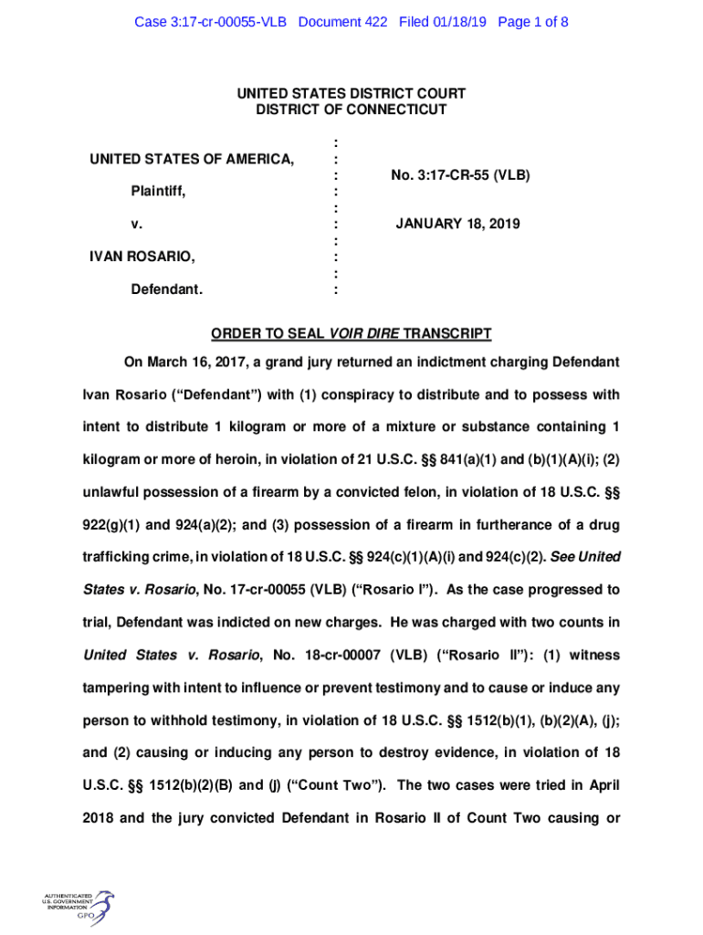Case 3:17cr00055VLB Document 422 Filed 01/18/19-Page 1 of 8UNITED STATES DISTRICT COURT DISTRICT OF CONNECTICUTUNITED STATES OF AMERICA, Plaintiff, v. IVAN ROSARIO, Defendant.: : : : : : : : : :No.