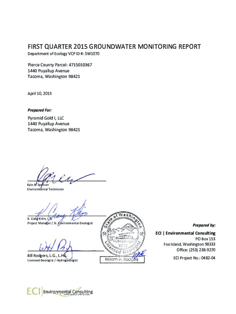 FIRSTQUARTEER2015GROUN NDWATERMONITORINGREPORTT Depart me entofEcologyyVCPID#:SW W1070 Pierce Co outparcel:471501036 67 1440PuyyallupAvenu UE Tacoma, Washington n98421 April10,2 2015 Prepared:PyramidGoldI,