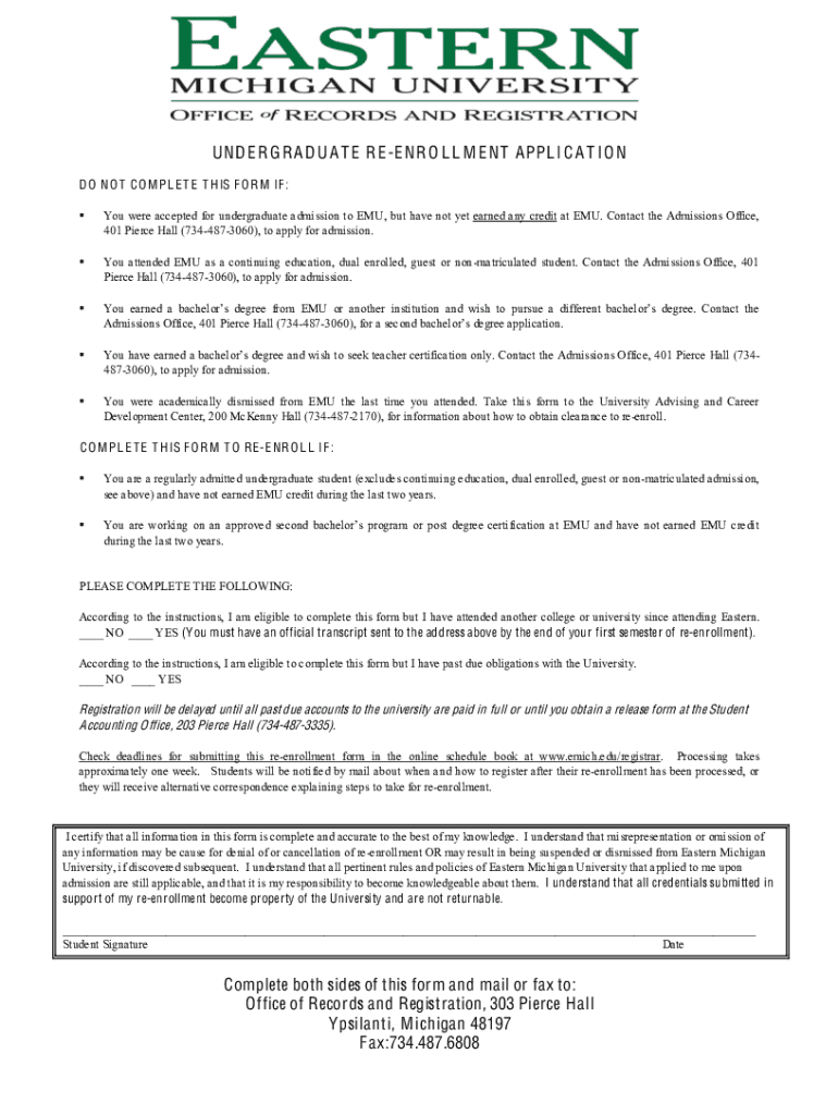 UND E R G R A DU A T E R EE NR O L L M E N TA PPL I C A T I O N D O N O T C O M P L E T E T H IS F O R M I F : You were accepted for undergraduate admission to EMU, but have not yet earned any credit
