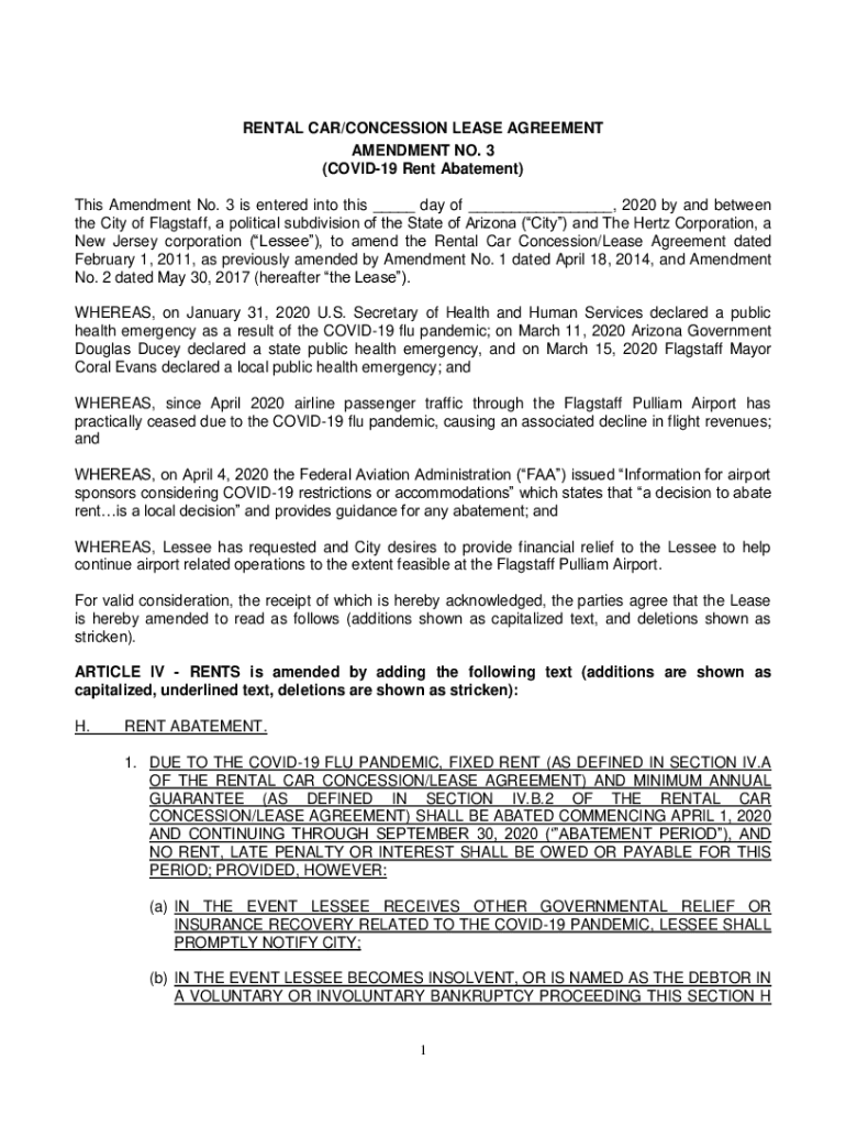 RENTAL CAR/CONCESSION LEASE AGREEMENT AMENDMENT NO. 3 (COVID-19 Rent Abatement) This Amendment No. 3 is entered into this ___ day of ___, 2020 by and between the City of Flagstaff, a political subdivision
