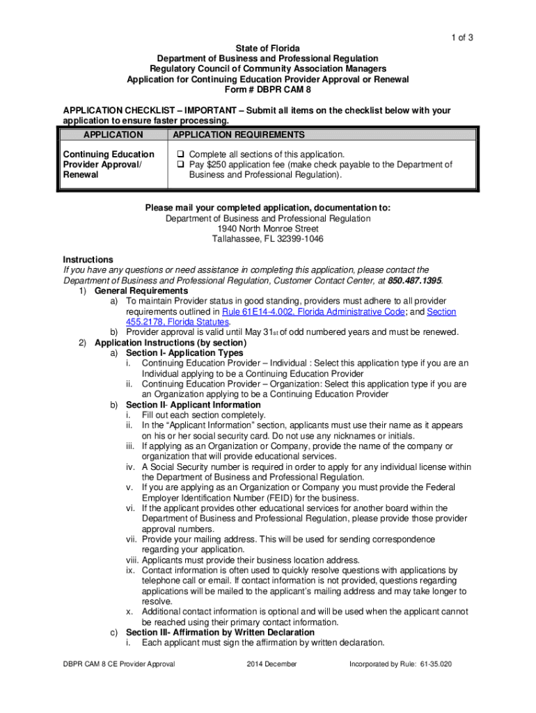 1 of 3 State of Florida Department of Business and Professional Regulation Regulatory Council of Community Association Managers Application for Continuing Education Provider Approval or Renewal Form