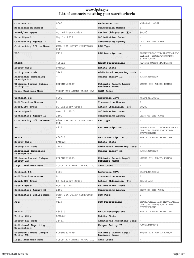 WWW.PDS.gov List of contracts matching your search criteria Contract ID:0003Reference ID:W52P1J11D0069Modification Number:1Transaction Number:1Award/ID Type:DO Delivery Operation Obligation ($):$0.00Date