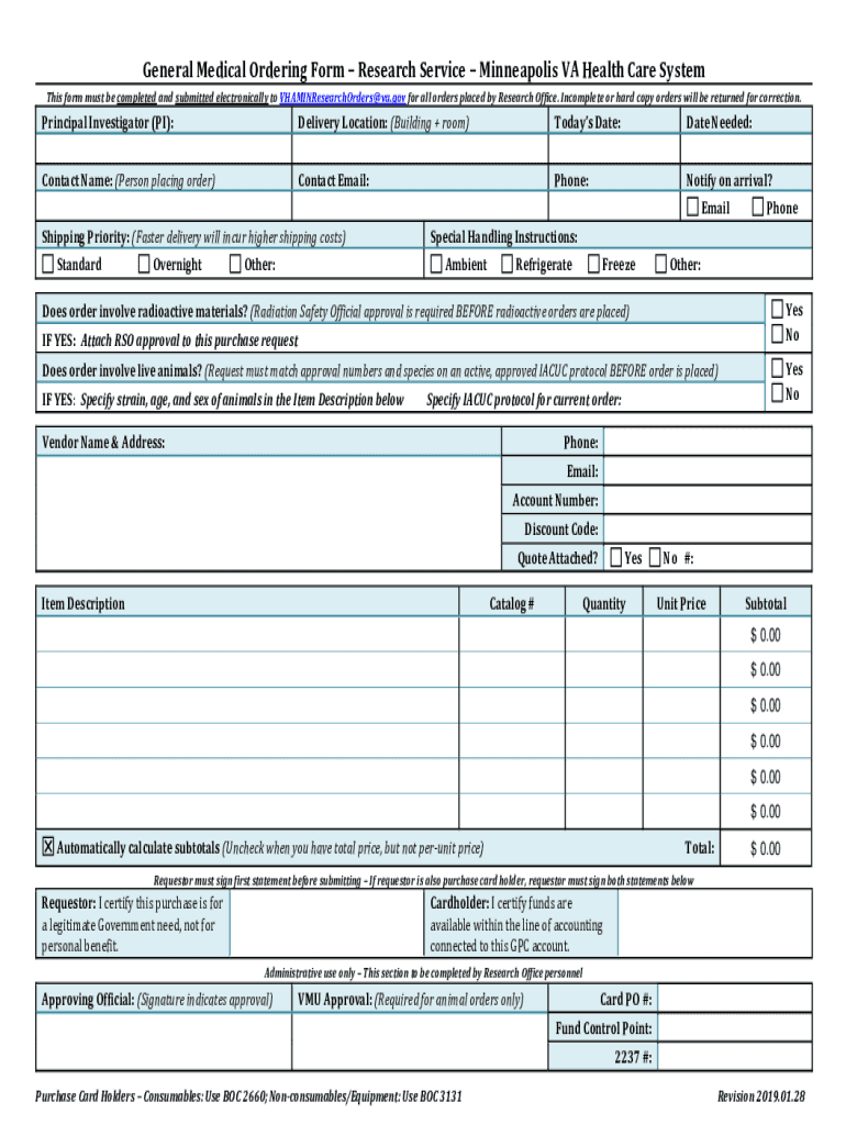 General Medical Ordering Form Research Service Minneapolis VA Health Care Systems form must be completed and submitted electronically to VHAMINResearchOrders×VA.gov for all orders placed by Research
