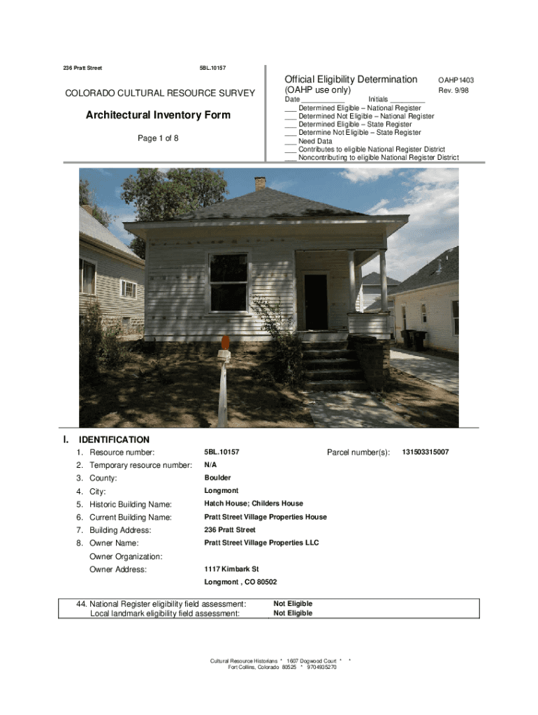 236 Pratt Street5BL.10157Official Eligibility Determination (OAHU use only)COLORADO CULTURAL RESOURCE Surveyable ___ Initials ___ ___ Determined Eligible National Register ___ Determined Not Eligible