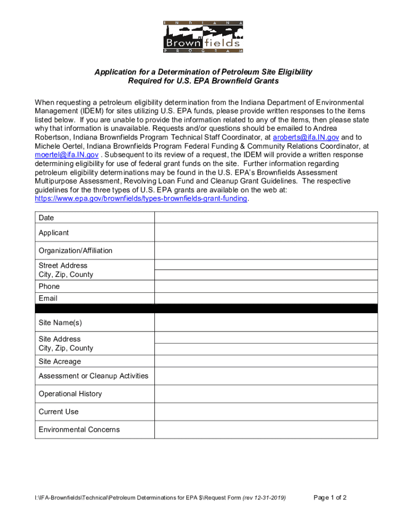 Application for a Determination of Petroleum Site Eligibility Required for U.S. EPA Brownfield Grants When requesting a petroleum eligibility determination from the Indiana Department of Environmental