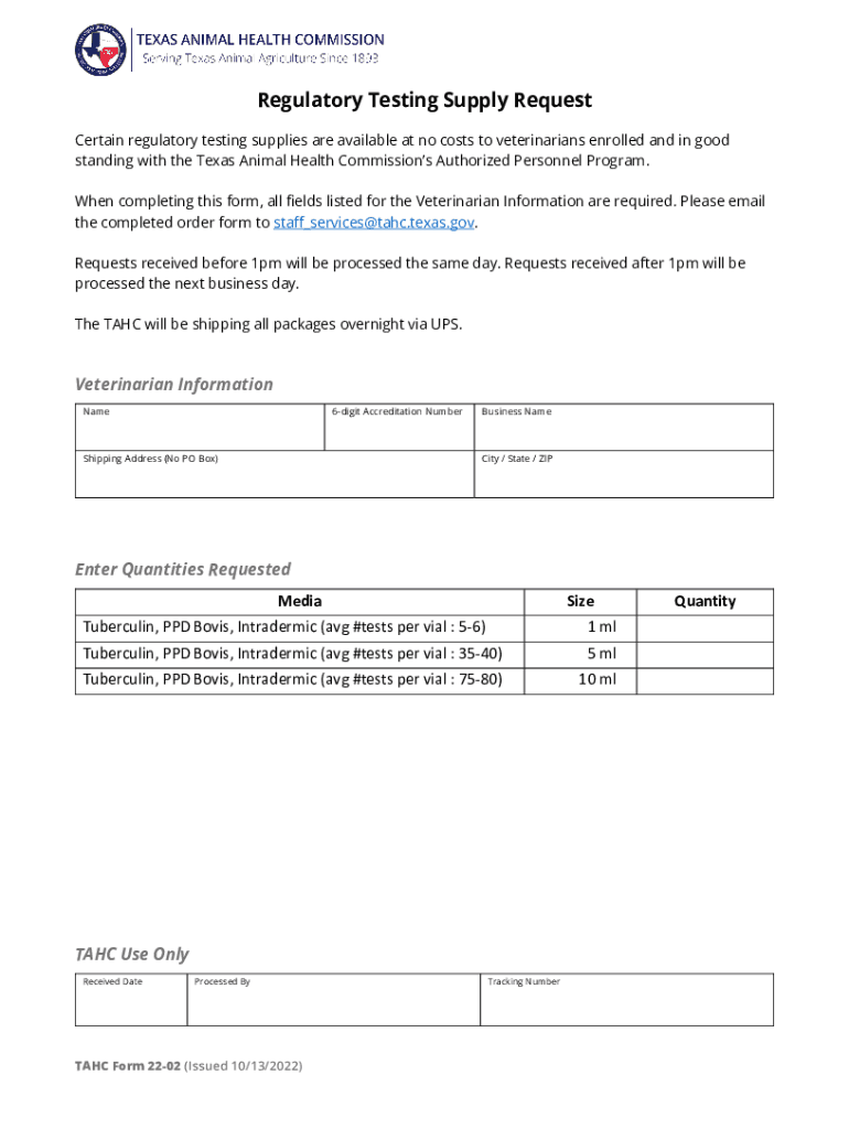 Regulatory Testing Supply Request Certain regulatory testing supplies are available at no costs to veterinarians enrolled and in good standing with the Texas Animal Health Commissions Authorized Personnel