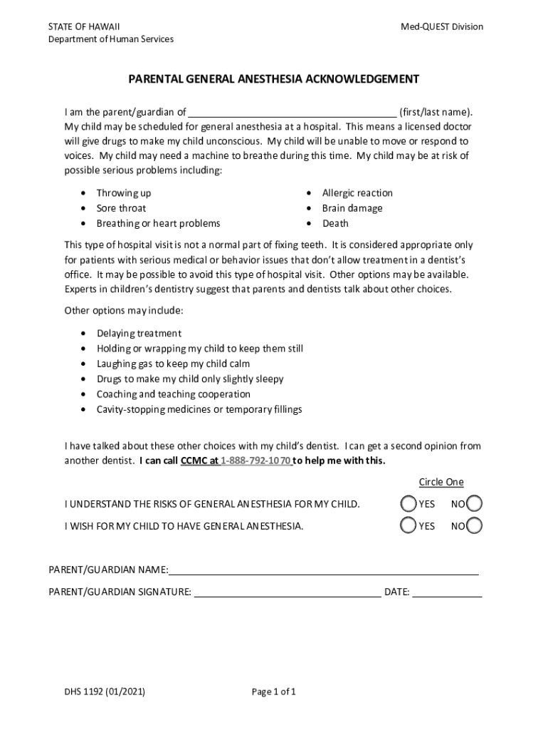 Clear Formulate OF HAWAII Department of Human ServicesMedQUEST DivisionPARENTAL GENERAL ANESTHESIA ACKNOWLEDGEMENT I am the parent/guardian of ___ (first/last name). My child may be scheduled for