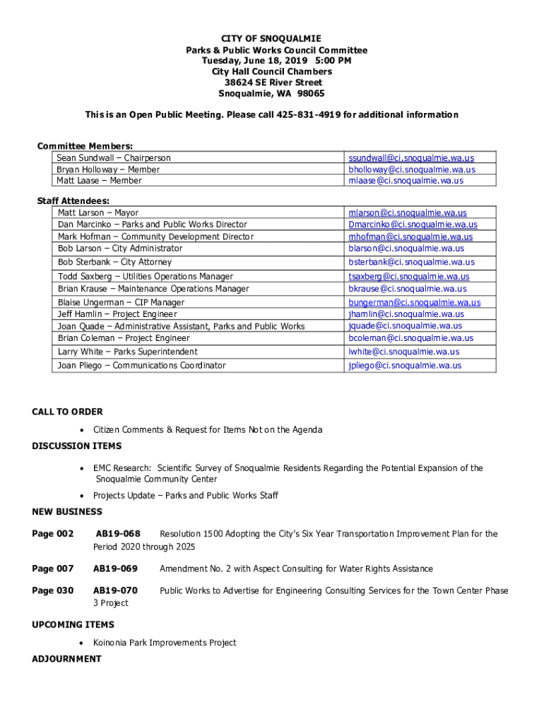 CITY OF SNOQUALMIE Parks & Public Works Council Committee Tuesday, June 18, 2019 5:00 PM City Hall Council Chambers 38624 SE River Street Snoqualmie, WA 98065 This is an Open Public Meeting. Please