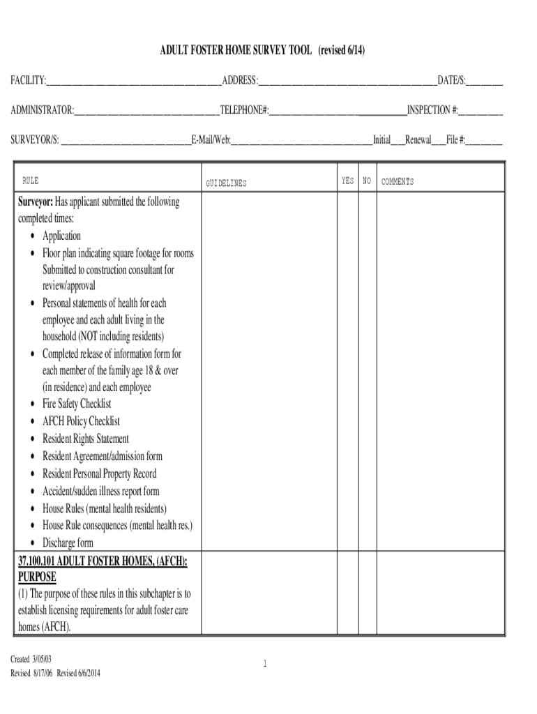 ADULT FOSTER HOME SURVEY TOOL (revised 6/14) FACILITY:___ADDRESS:___DATE/S:___ ADMINISTRATOR:___TELEPHONE#:___INSPECTION #:___SURVEYOR/S: ___Email/Web:___Initial___Renewal___File #:___ RULEYESGUIDELINESSurveyor:
